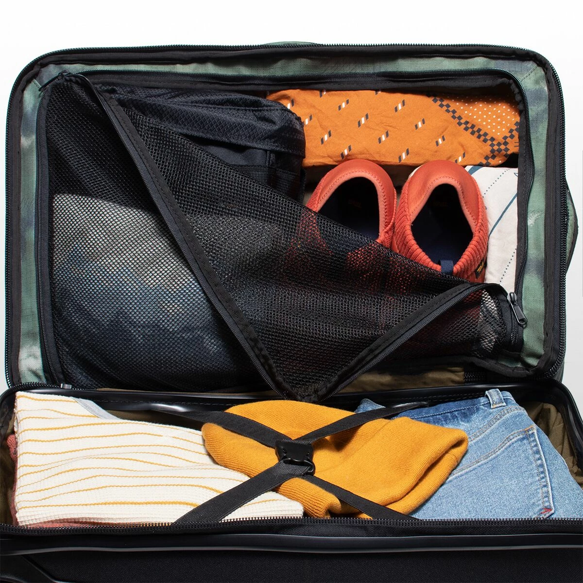 - Split level design and mesh divider keep your belongings organized